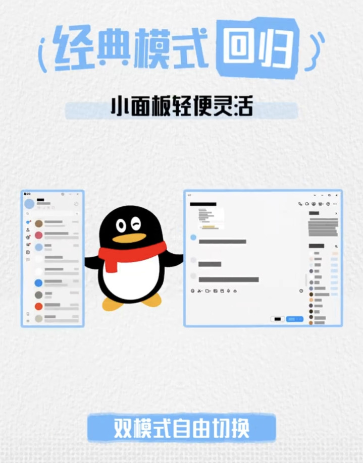 12月8日,腾讯QQ官方微博高调宣布:“熟悉的QQ又回来了!”PC端新增经典/现代双模式切换功能,用户可以一键回到那个蓝色系默认皮肤、简约布局的经典版本。
